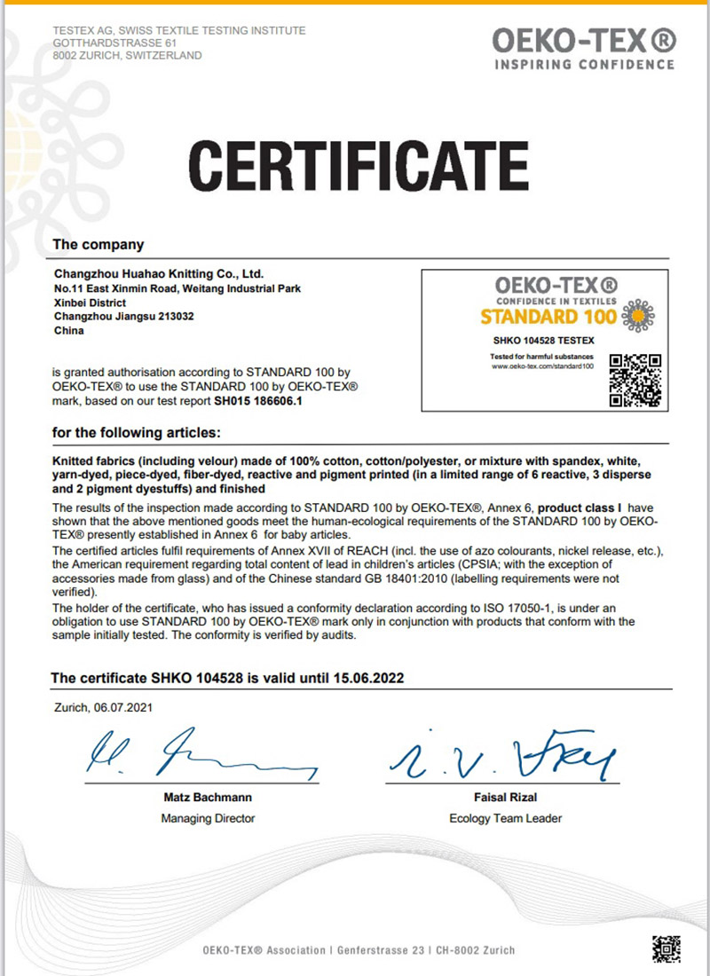 生地のOEKO-TEX証明書